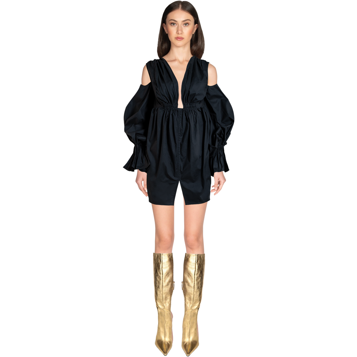 Crafted from a breathable, structured blend of 97% Organic Cotton and 3% Spandex, this dress holds its sculptural shape while remaining comfortable enough for all-day wear. A deep, gathered V-neckline frames the torso, while cold-shoulder cutouts reveal just the right amount of skin. The body cinches softly at the waist for shape, then releases into an airy, voluminous skirt that lands mid-thigh.
