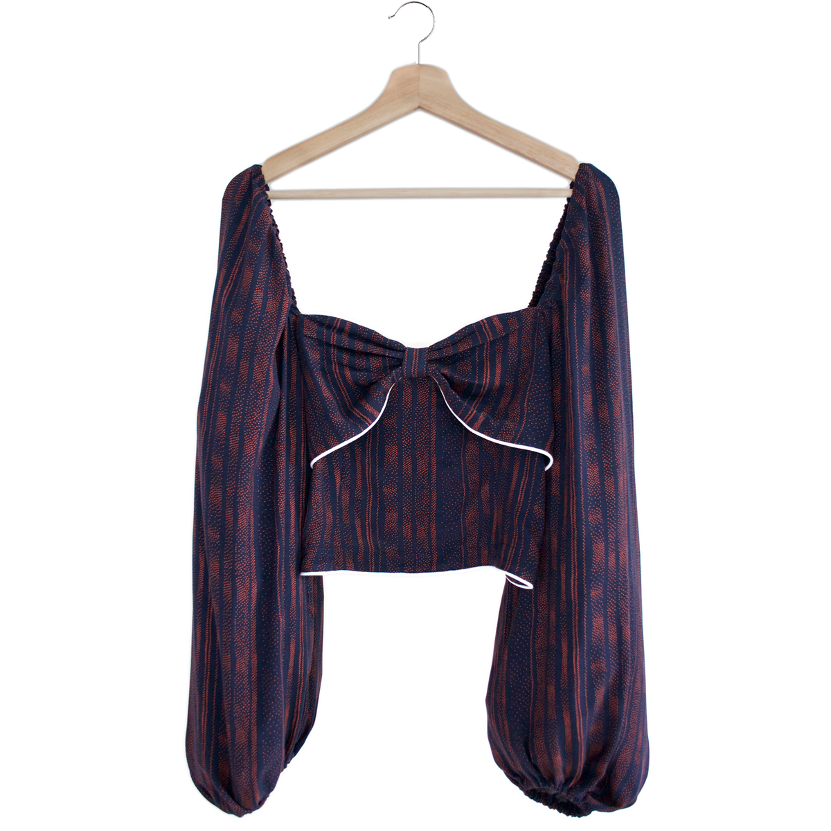 Gertrude Top is a fitted corset style bodice that snaps in the back. The front bodice has a built in outer bra top that is gathered in center. Sleeves are extra large and gather around the wrist to create puff. The sleeves gather with elastic round shoulder. Top has piping at seams and hem sits at natural waist.