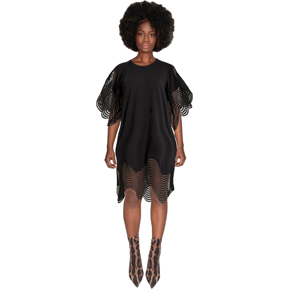 Made from 95% Organic Cotton and 5% Spandex, the body of the dress offers breathable stretch with a soft, elevated handfeel. The true standout is the engineered wave edging: a cascading, undulating trim at the sleeves and hem that creates movement with every step. The effect is architectural yet wearable — a quiet showstopper that catches the eye without asking for attention.