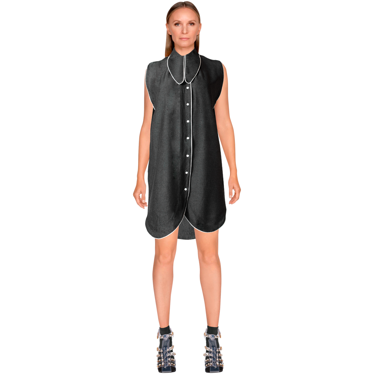 The sleeveless design is framed by an exaggerated, sculptural Peter Pan-style collar, accented by white cotton piping that traces the seams for a crisp, tailored finish. A rounded, tulip-inspired hem adds a gentle curve to the minimalist shape, while a button-down front keeps it sleek and versatile.