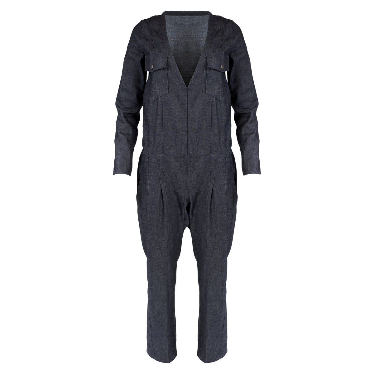Oversized coverall has a deep v-neckline. The top has two pockets with flaps and snap closures. The pant fronts have pleat details. Denim is a 12.5 oz. recycled crosshatch form Bossa Mills in Turkey.