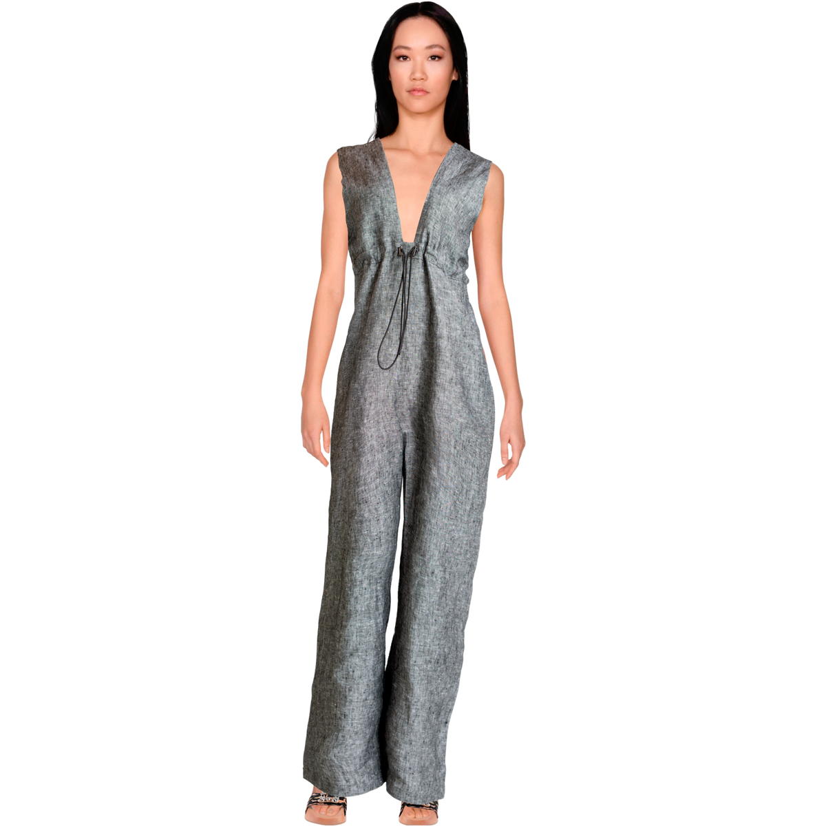 Sleeveless jumpsuit has a plunging neckline in front and V in back. The jumpsuit has an elastic paracord that gathers under bustline with toggle closures. Jumpsuit has side pockets.