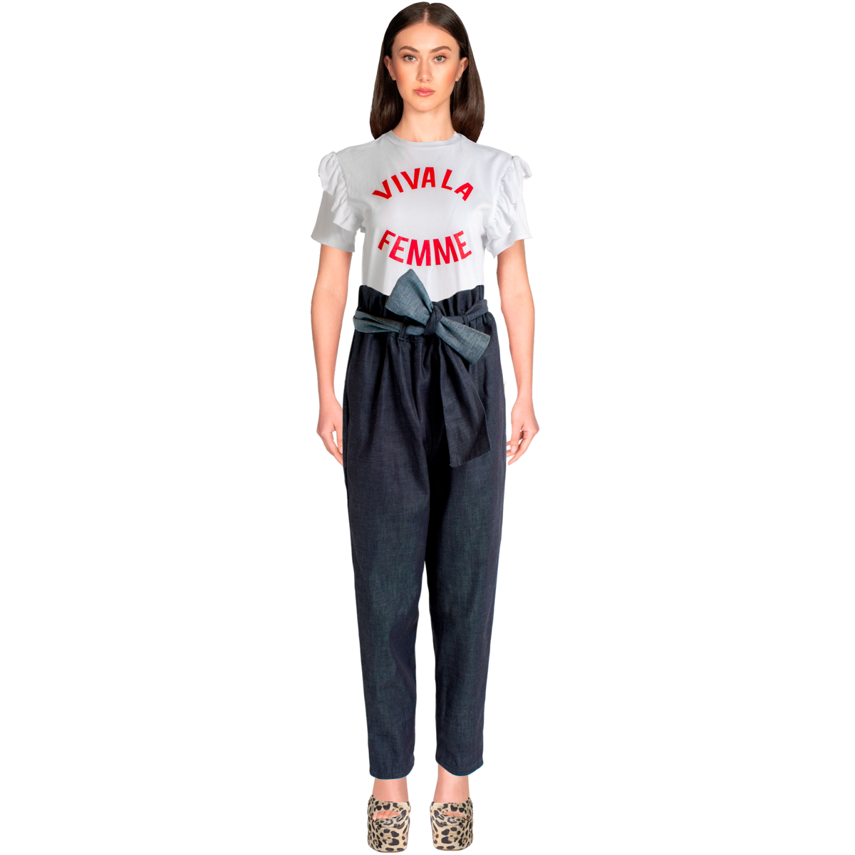 This T-shirt is a part of a small Feminist series. The T-shirt has ruffle detail on the sleeve and a relaxed fit.